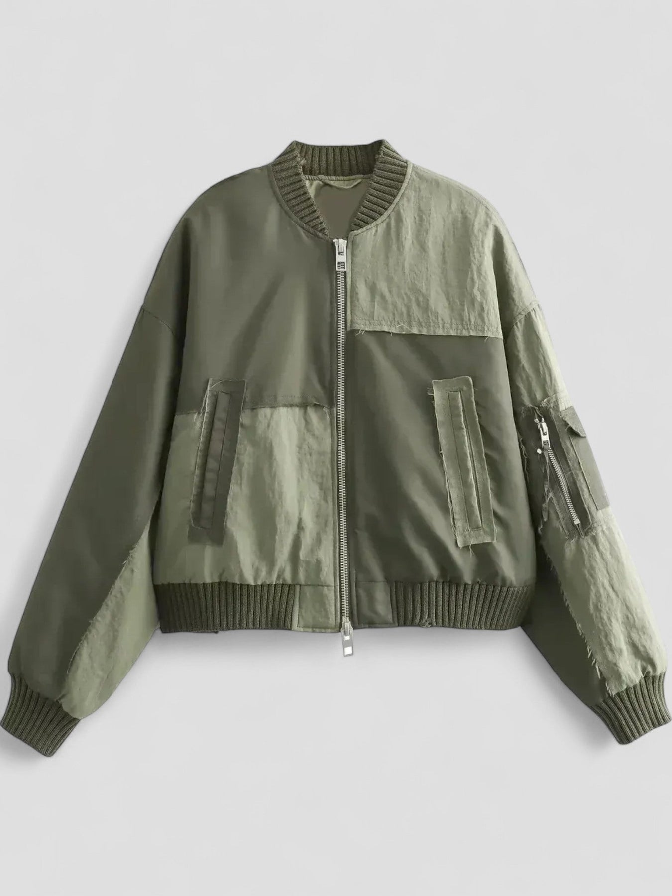 The loose bomber cut, paired with a unique patch panel design, infuses any ensemble with a dash of urban cool.